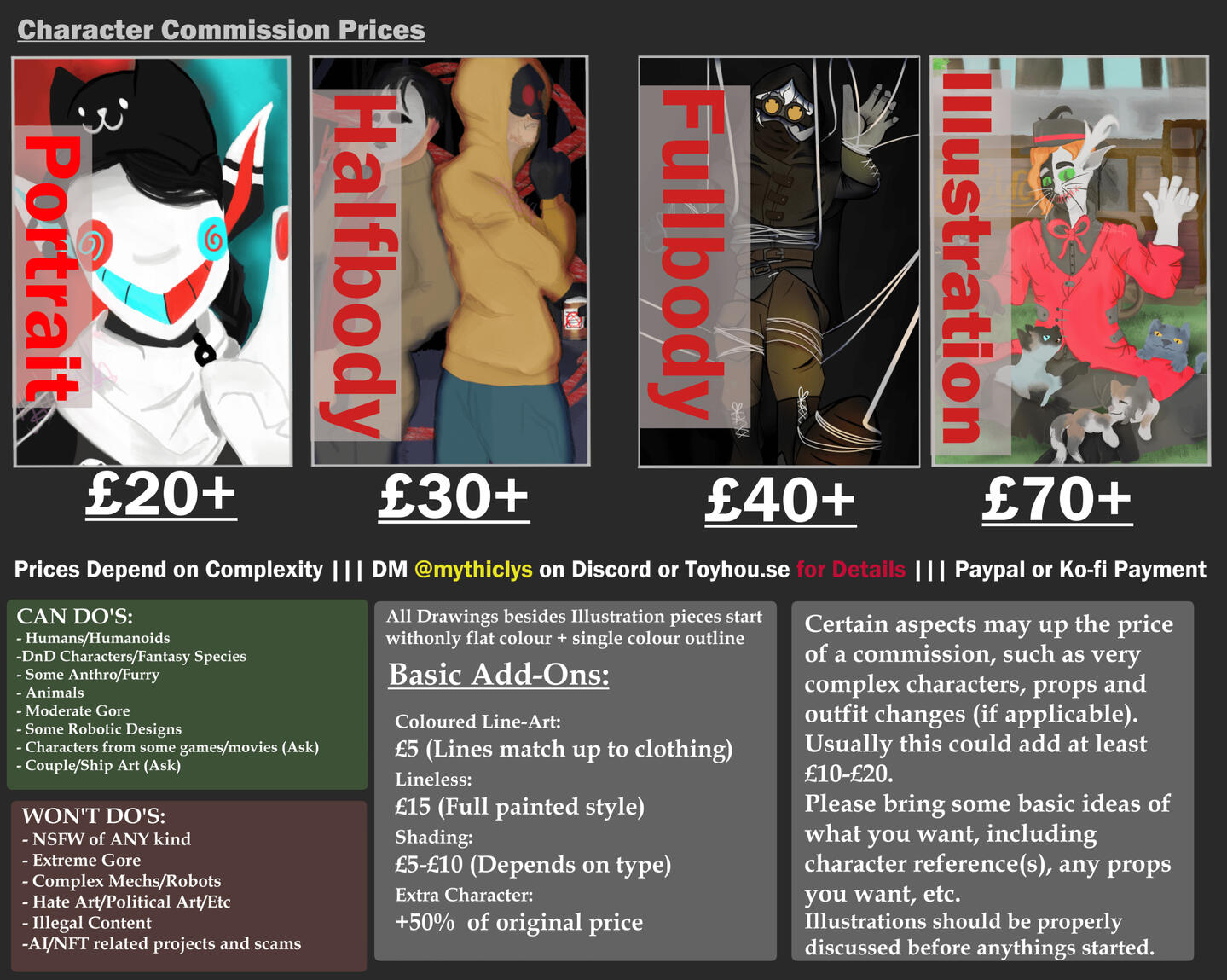 - If the artist for some reason takes longer than the mentioned time, the client will be informed appropriately of this.As the artist, I will do my best to provide active updates if the commission type is not SKEB-Like. This means you will be promptly updated if a big update has been made on something like Sketch, Lineart, Colour or Rendering (If applicable). Please do not keep prodding the artist for updates, they will come, however if no updates have been provided in 2 weeks, you may ask.My Work Days are usually whenever I am free during the week (Monday to Friday) from 5:00PM-10:00PM GMT+0 (United Kingdom/Greenwich Mean Time). Sometimes I, Mythiclys, may work on the weekend if I am in the mood for it, but as a human being I even need breaks and days off.USE